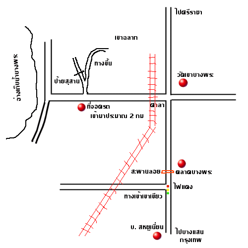 วิ่งตามถนนสุขุมวิท ผ่านนศรีราชามาประมาณ 3-4 กม. จะเห็นปั้ม JET ซ้ายมือ วิ่งต่อมาเรื่อยๆ จะเห็นวัดเขาบางพระซ้ายมือ ตรงข้ามวัดเขาบางพระจะเห็นเขาฉลาก จะมีที่กลับรถ เลี้ยวขวาเข้าไปข้างใน ทางเข้าจะมีทางรถไฟติดถนนเลย และมีศาลาด้วย เข้ามาประมาณ 2 กม. มองทางขวามือจะเห็นป้ายสุสาน และทางขึ้นเขาฉลาก จอดรถทางด้านซ้ายมือก็ได้ จะมีที่จอดได้