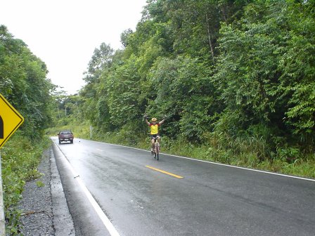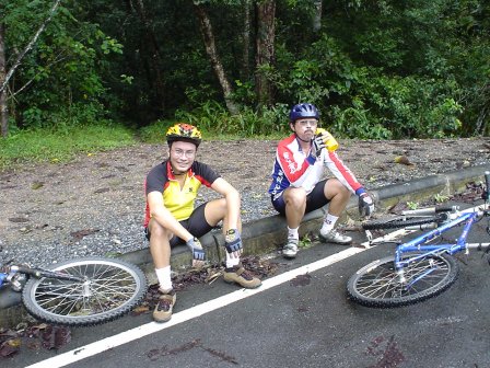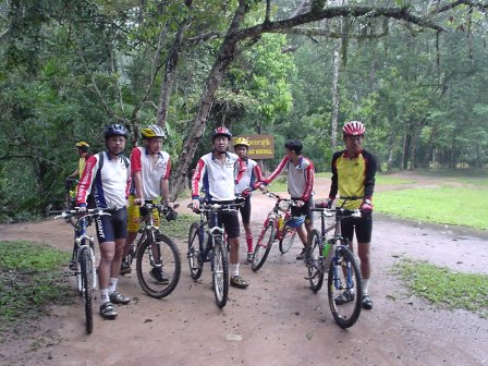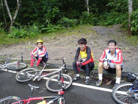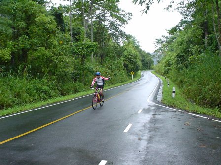 6.00 น. สมาชิกทั้งหมด 7 ชีวิต ก้อมาปรากฏตัวที่ปั๊ม Jet โดยมี เสือหวาน, นาย Trek คุณด้วง ลุงอ๊อด โอปอ เสือแดง (วันนี้มาทำหน้าที่ Service) และผม นายหน่อย หลังจากเตรียมเครื่องดื่มอาหารระหว่างทางเสร็จ เราก้อเริ่มออกเดินทางทันที พอเริ่มเดินทางฝนก้อตกลงมาทันที เราก้อได้แต่หวังว่า ไปถึงที่หมายฝนคงจะหยุดนะ แต่ปรากฏว่าฝนตกหนักลงมาทุกที ยิ่งเข้าใกล้เขาใหญ่ยิ่งตกหนัก พอถึงปราจีนบุรี เราเลยไปพักหาอาหารเช้ากินกันก่อนตัดสินใจกับอนาคตตัวเอง ซักพัก คุณ Ishiko ก้อมาถึง ตอนนี้สมาชิกครบแล้วเอาไงดี เขาใหญ่ก้อมาถึงแล้ว ยังไงก้อลองเข้าไปดูก่อนแล้วกัน เราเดินทางต่อไปถึงโรงแรมเขาใหญ่ที่เรานัดเป็นจุดเริ่มต้น ฝนเริ่มซาลงบ้างแล้ว แต่ยังถือว่าไม่น่าปั่นอยู่ แต่เดี๋ยวก่อน ลองมองไปบนเขาสิ ฟ้าเปิดโชคดีของเราแล้ว งั้นเราขับขึ้นเขาไปหน่อยดีกว่า ไปจอดที่น้ำตกเหวนรกก้อได้เผื่อจะปั่นได้ นาย Trek ออกความเห็น ซึ่งทุกคนก้อเห็นด้วย ปั่นน้อยดีกว่าไม่ได้ปั่น เราเลยเดินทางต่อมาถึง น้ำตกเหวนรก เป็นไปตามคาด ฝนเกือบหยุดแล้ว เราทุกคนจอดรถแล้วเตรียมเจ้าเสือคันเก่งของตัวเลยออกมาทันที