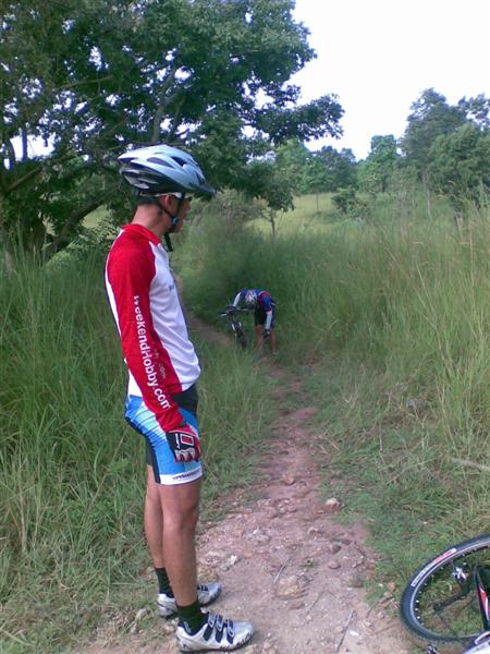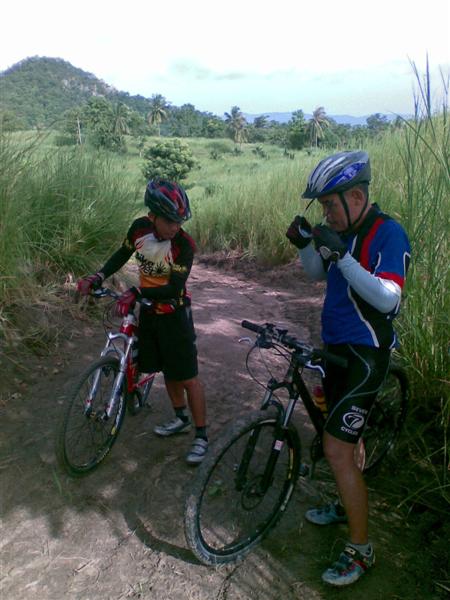 วันนี้มากันเกือบครบครับ มีเสือติ่ง เสือเขียว เด็กแร๊ป เสือคม เสือแป๊ะ เสือสิทธ์และผมครับ นัดเจอกันที่เดิม ผมกะเสือคมปั่นกันตั้งแต่เลี่ยงหนองมน ไปได้ครึ่งทางก็กระโดดขึ้นรถกระบะของเสือสิทธ์