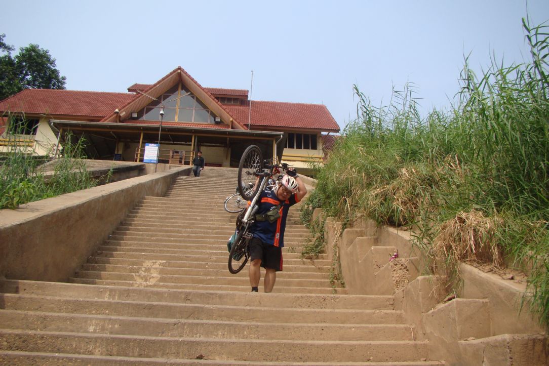 ปั่นมาถึงด่านแอ๊คชั่นถ่ายรูปกันเต็มที่ แต่พอเดินเข้าไปเจ้าหน้าที่บอกว่าจักรยานข้ามไม่ได้ครับ ไม่มีใครรู้มาก่อนคิดว่าข้ามได้เหมือนที่หนองคายเลยต้องย้อนกลับไปข้ามเรือในตัวเมือง