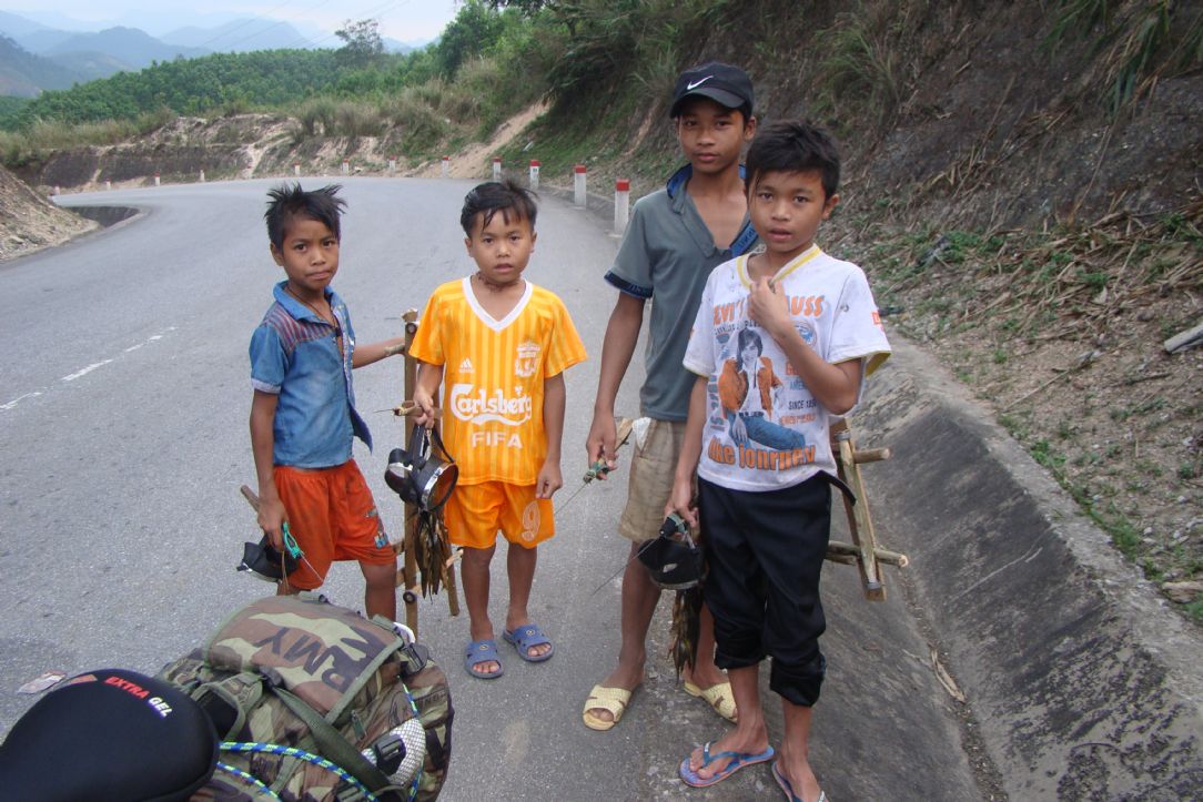 เจอเด็กๆระหว่างทางเพิ่งกลับจากหาปลา ที่เห็นถือมาลักษณะเป็นไม้สี่เหลี่ยมคือรถครับเอาไว้ขี่ลงจากเขา