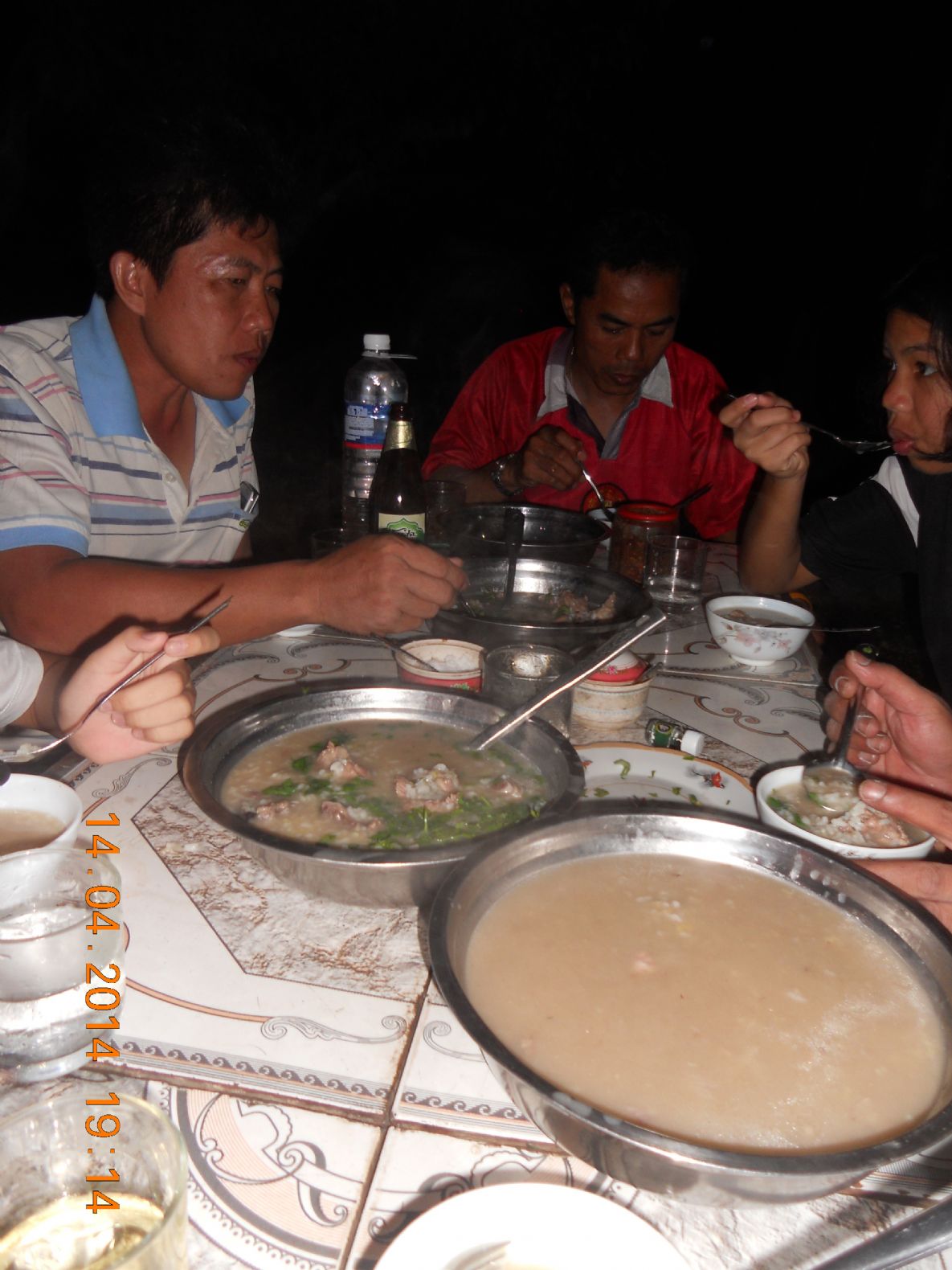 อาหารแบบเต็มอิ่มมื้อแรก ข้าวต้มใส่กระดูก ทีแรกเราเข้าใจว่าน่าจะเป็นข้าวสวยกับหมูทอดอุตส่าห์บุกเข้าไปอธิบายถึงในครัวแล้ว ไม่คิดว่าจะกลายเป็นข้าวต้มแต่ก็เอาเถอะหิวมากๆซัดไม่เหลือ