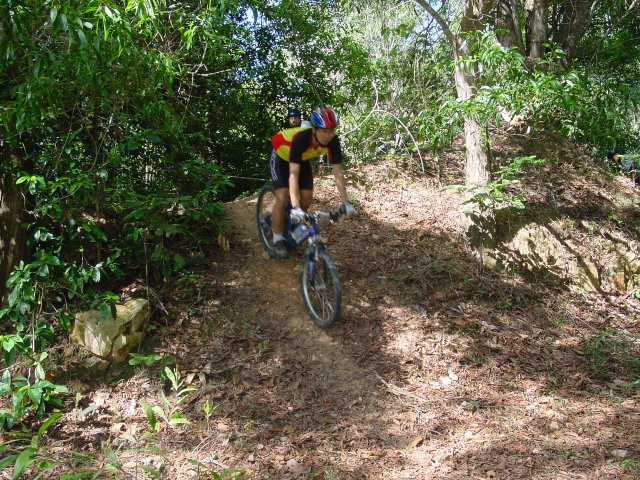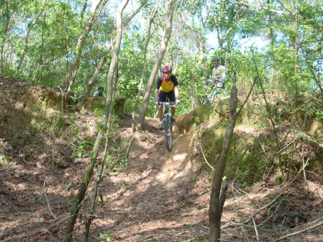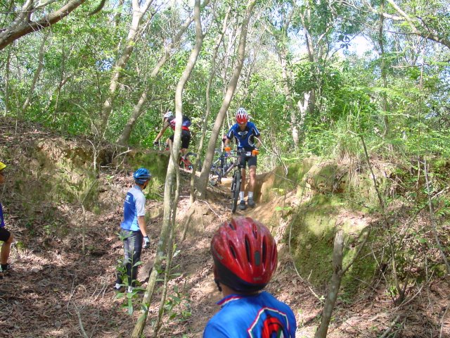 เริ่มจากตรงนี้แหละที่ความมันส์มาเยือนเพราะเริ่มรู้เส้นทางแล้ว ช่วงแรห อัดขึ้นเนิน แล้วลงดาวฮิว ที่ยากพอควรเพราะอัดขึ้นเนินจนสุดแล้วไหลลงเนินเลย ทางขรุขระมีหินลอย ต้นไม้ขวาง แต่พวกบ้า UTC ก็ไม่ยอมเข็นกันลงมาเลย ไหลกันมาตลอดทาง พอลงเนินนั้นมาได้ก็จะเจอร่องน้ำลึก ที่ทิ้งดิ่งแล้วกระดกขึ้นเลย ตรงนี้เสือปิ๊กมี่ (เสือประสิทธิ์) ก็โดนจานหน้ากัดขาเข้าให้ เลือดสาดไปเลย (พี่เค๊าก็แปลกไป ไหนแต่ละทีต้องได้แผลกลับมา มีหวังเมียไม่ยอมให้มาขี่อีกแน่) จากนั้นก็วิ่งตามแทรกเดิมไปเรื่อยๆ ดาวฮิวระหว่างทางก็มีให้วัดใจกันตลอดทาง เพราะจะดิ่งสั้นๆ แต่จะไม่มีหิน นอกจากต้นไม้ให้เกาะ หากควบคุมรถไม่ได้ ช่วงนี้เองที่เริ่มสนุก เพราะไปทับทางเก่าที่เริ่มตอนแรกๆ และเริ่มหาลูกศรเจอ ผมก็นำหน้าอีกตามเคย เพราะมี GPS อยู่บนแฮนด์ และก็เพราะนำหน้านี่แหละ ก็ไปเกี่ยวเอารังแตนที่อยู่ตามใบไม้ข้างทางมาด้วย มันดันเข้าไปในเสื้อ โดนต่อยไปหกที ปวดเกือบตาย (ยังบวมอยู่เลยเนี่ย) แต่ปวดอยู่ได้แป๊บนึงก็หายปวดเลยขี่ต่อ