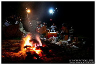 การกลับรถด้วยอาการไม่เต็มร้อยของหนูขาว เล่นเอาเหนื่อยพอแรง แต่ด้วยแรงใจและเนว์ไม่ต่ำกว่าสี่คนก็พาเจ้าหนูขาวกลับรถในทางแคบและชันได้ พร้อมย้อนขบวนกลับมาเพียงแค่ต้มน้ำเดือด เราก็ย้อนกลับมาตั้งแคมป์ที่ห้วยทรายตามเดิม มาถึงเวลานี้ อากาศเริ่มเย็นลงอย่างรวดเร็วแม้ตะวันจะยังไม่ลับฟ้าก็ตาม หลายคนเป็นห่วงเจ้าของบ้านตัวโต (ช้างป่า) จะออกมาเยี่ยมเยือนเนื่องด้วยรอยเท้า และขี้กองโตมีเห็นเห็นเกือบตลอดเส้นทาง เราจึงรีบก่อกองไฟไล่ความหนาวที่เริ่มตั้งเค้า และเผื่อป้องกันไม่ให้เจ้าของบ้านลงมาหาเราอย่างน้อยก็ชั่วเวลาหนึ่ง สายน้ำใส แต่เย็นยะเยือกทำให้ทุกคนหายเหนื่อย จากการเดินทางที่ยาวนาน บางคนเองหลังแล้วผล็อยหลับไปในช่วงเวลาไม่นาน บางคนก็สาละวนกับการเตรียมอาหารเย็นก่อนตะวันลับฟ้า บ้างก็งัดกล้องมาถ่ายบรรยากาศแค้มป์พักและธรรมชาติสวยงามบริสุทธ์ที่รายรอบตัวเรา บรรยากาศมิตรภาพยามค่ำคืนช่างผ่านไปอย่างรวดเร็วเหลือเกิน ใช้เวลาดื่มกินไม่นานก็พบว่า ดาวดวงเดือนลอยเด่นอยู่กลางฟ้า แม้จะมีเค้าเมฆฝนตั้งเค้าอยู่ไกล ๆ ก็ตามที น้องแจ๊คของผมรับทำหน้าที่เป็นเวรดูแลกองไฟ เผื่อมั่นใจว่าอย่างน้อยก็มีควันไฟครุกรุ่น อยู่ทั้งคืนที่เรานอนหลับใหลไปป่าดงพงไพรแห่งนี้