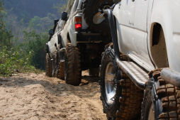 กว่าจะเตรียมเสบียงอาหาร ก็ปาเข้าไปร่วม 9 โมงเช้าก่อนที่ขบวนเราจะวิ่งลัดเลาะไปตามริมเขื่อนเขาแหลม ทองผาภูมิ มุ่งไปสู่จุดหมายที่รอเราอยู่ ผมมักจะได้รับเกียรติให้เป็นผู้นำคันแรกเสมอ อาจจะเป็นเพราะผู้รู้เส้นทางคนเดียวในกลุ่ม แต็ก็หลาย ๆ ครั้งก็นำทั้งทั้งที่ไม่รู้ ซึ่งเป็นเกียรติที่ไม่ค่อยจะนิยมชมชอบเท่าไรนัก เพราะมักจะเป็นผู้รับเกียรติคนแรกที่เหมือนกันที่ต้องลากออกไป ต่อจากนี้ไปก็คงต้องหาผู้สืบทอดภาระหน้าที่นี้ให้รุ่นใหม่ ๆ สด ๆ ในกลุ่มที่คงต้องใช้เวลาโน้มเน้ากันต่อไป สำหรับห้วยแรกที่เราวิ่งข้ามน้ำไม่มากนักในหน้านี้ ผิดกับครั้งที่เราที่เราเคยข้าม ที่เกือบท่วมฝากระโปง แต่คราวนี้ด้วยระดับน้ำแค่แก้มยางทำให้ผมสบายใจล่วงหน้าถึงยังห้วยที่สองที่ถึงแม้ระดับน้ำจะไม่ลึก แต่ด้วยร่องแคบริมโตรก เขามักจะทำให้ห้วยที่สองนี้น้ำแรง จนเจ้าหนูขาวที่น้ำหนักตัวสองตันกว่า ๆ เซได้เหมือนกัน เส้นทางระยะทาง 3 กิโลแรกมีแต่ฝุ่นแดง ๆ ที่พวกเราวิ่งลัดเลาะไปตามสวนยางที่เริ่มเห็นปลูกหนาตามายสิ่งขึ้นตามผืนป่าเมืองกาญจ และก็ที่เมืองกาญจอีกนั่นแหละที่เป็นที่ในไม่กี่ที่ในเมืองไทยที่สายน้ำไม่เคยเหือดหายแม้ยามแล้งแบบนี้ เส้นทางช่วงแรกไม่มีปัญหาสำหรับผมเท่าไรนักเพราะเคยเข้ามาสำผัสอยู่บ้าง หรือจะมีลังเลก็ยังได้เนว์อย่างจิงโจป่าช่วยเตือนความจำอยู่บ่อยครั้ง ริมสองข้างทางจากป่าเสื่อมโทรมตอนนี้กลายมาเป็นป่ายางสุดลูกหูลูกตา บ้างก็ขยายแนวรั้วออกมาชิดถนนลูกรังจะแทบจะล้ำออกมา