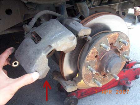 1. ถอดน๊อตยึดคาลิเปอร์ตัวล่างออก..แล้วยกชุดคาลิเปอร์ขึ้น แบบนี้
