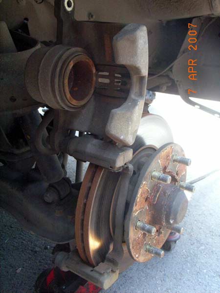 เวลาดันลูกสูบกลับเข้าไปต้องคอยตรวจสอบกระปุกน้ำมันเบรกด้วยนะครับเดี๋ยวน้ำมันเบรคจะล้นออกมา ต้องคอยดูดออกเรื่อยๆ คราบขี้เกลือที่เห็นในภาพอาจจะเกิดจากการที่น้ำยากันสนิมหม้อน้ำที่รวมอยู่กับน้ำซึมออกมาแล้วทำปฎิกิริยากับอากาศ ทำให้เกิดขี้เกลือขึ้น ถอดสายยางออกมาทำความสะอาดแล้วทาจารบีใส่เข้าไปใหม่เปลี่ยนเหล็กรัดสายอันใหม่ก็น่าจะหายครับ(เป็นประสบการณ์ที่เจอมากับรถตัวเองครับ)