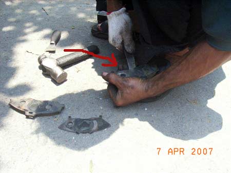 อีกขั้นตอนหนึ่ง เวลาเราถอดผ้าเบรคออกมาแล้ว เราจะต้องแซะแผ่นรองผ้าเบรคออกมาด้วย เพราะเราจะต้องใช้มันใส่กลับเข้าไปในผ้าเบรกอันใหม่