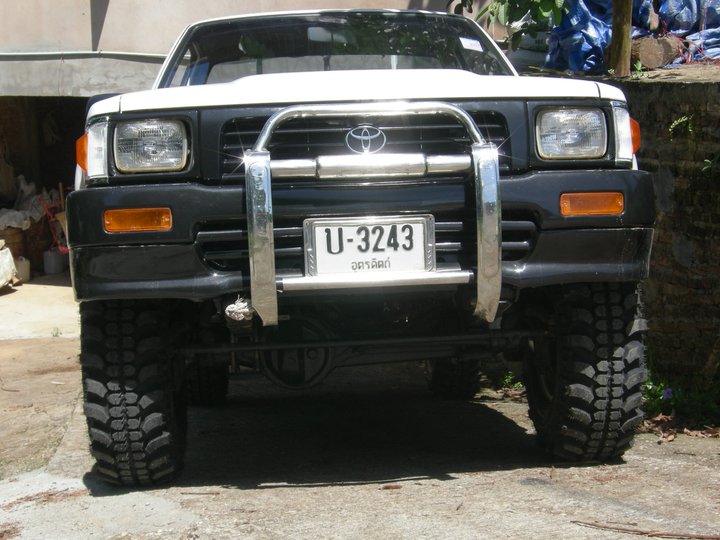 สังเกตุดูปีกนกยกสีฟ้า เขาจะออกแบบมาแก้ปัญหานี้โดยตัดปลายมนออกเพื่อไม่ให้มีส่วนยื่นไปสีกับยาง ซึ่งหากใส่แมกซ์ออฟเซต0 หรือลบนิดๆและใส่ยางไม่เกิน 265/70/16 ก็ผ่านได้ไม่มีปัญหาอะไร แต่อาจต้องปาดปลายคิ้วออกเล็กน้อย และต้องยอมรับการชันของเพลาข้างและยางหุ้มเพลาเสียเร็ว