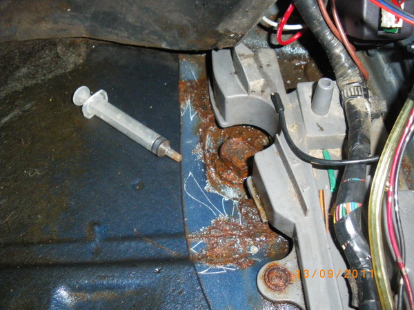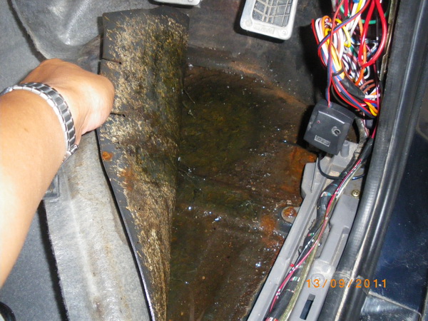 ทีนี้ถึงเวลาทำความสะอาด ดูเหมือนไม่มีอะไร ก็เริ่มเอาแผ่นยางรองเท้าและพรมอีกชั้นออกไปเคาะ ที่พรมบางแข็งติดรถมีเศษทรายก็เอาผ้าเช็ดไปเรื่อยๆ....สายตาพลันเหลือบไปเห็นขอบพรมแข็งมีแสงสะท้อนขึ้นมา ในใจก็คิดว่าฉีด DDTนิดเดียวทำไมมันฉ่ำขนาดนี้ ก็เลยงัดแผ่นพรมแข็งขึ้นมาก็เห็นคราบน้ำบนแผ่นยางสีน้ำเงิน ผมก็ร้องออกมาเป็นเพลง " เอ๊ะไอ้น้ำมันมาจากไหน แล้วนี่ใครพามันเข้ามา เปียกชื้นอยู่ใต้หว่างขา มันเรียกสกาหรือว่าเรกเก้..."