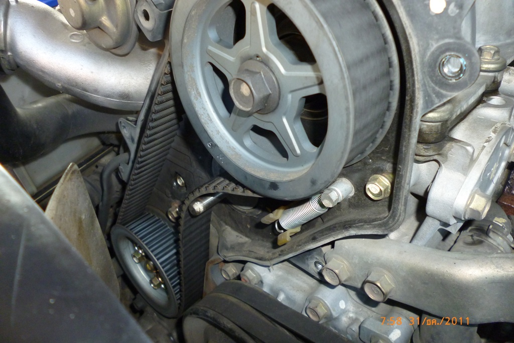 ใส่สายพานอันใหม่เข้าไป โดยคล้องด้านล่างที่เฟืองปั๊มก่อน แล้วก็คล้องด้านบนเข้ากับแคมชาร์ป ใส่ลูกรอกอันใหม่และน๊อต เข้าไป หมุนน๊อตด้วยมือเปล่าเข้าจนสุดเกลียว แต่ยังไม่ต้องขันแน่น กดลูกรอก(ด้วยมือเปล่า)ให้ไปกดสายพานให้ตึงพอสมควร และเวลาเดียวกันพยายามจัดสายพานให้ฟันลงร่องเฟืองบนและเฟืองล่าง ข้อสังเกตุคือ;ต้องให้เฟืองสายพานลงร่องให้สนิทและตึง(ตึงในด้านตรงข้ามลูกรอก)โดยดันให้ลูกรอกกดทับอยู่ด้วยมือเปล่า ขั้นตอนนี้ไม่ต้องกังวลว่าเฟืองจะหมุนจะขยับ หรือเฟืองเปลื่ยนตำแหน่ง เพราะว่าเฟืองทั้ง2ตัว มันแน่นมาก แน่นด้วยแรงกดของชิ้นส่วนภายในเครื่อง รับรองว่าเฟืองจะไม่ขยับแน่นอน โอกาสที่จะใส่พลาดไปหนึ่งร่อง-สองร่อง นั้นแทบจะไม่เกิดขึ้นครับ
