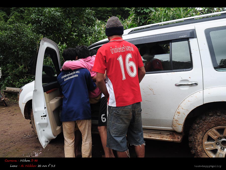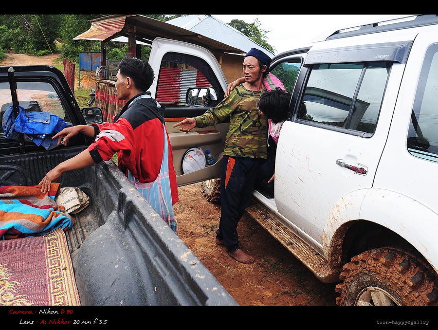 ในระหว่างที่ผมถ่ายรูป ก็มีชาวบ้านเข้ามาแ้จ้งว่า ญาติของเค้ากำลังป่วยหนัก เป็นมาหลายวันแล้วแต่ลงไปหาหมอไม่ได้เพราะในหมู่บ้านมีแต่รถกระบะขับ2 ไม่มี4WD เลยขอให้ผมไปส่งที่บ้านคอบือคีที่ผมผ่านมาแล้ว หลังจากนั้นถนนก็จะดีขึ้นพอที่กระบะธรรมดาจะไปได้ ซึ่งญาติที่หมู่บ้านนั้นจะรับไปส่งที่โรงพยาบาลต่ออีกที