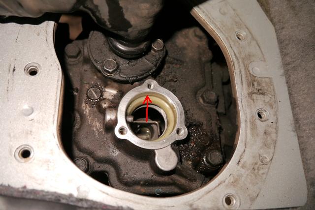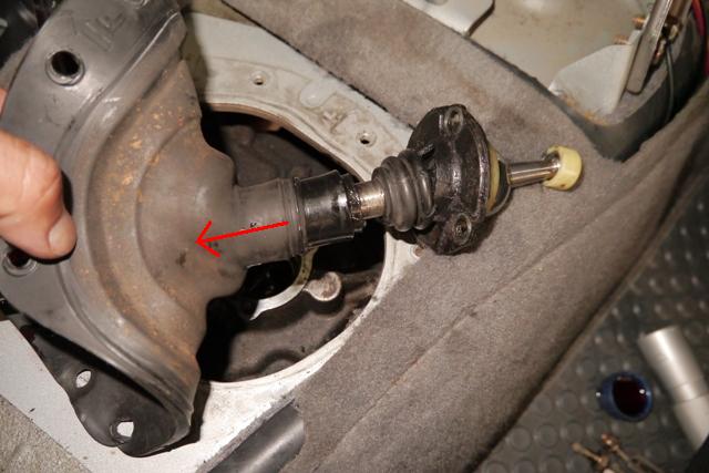 ถอดแผ่นยางเมื่อตะกี้ออกไปแล้ว ก็มาจัดการกับยางกันฝุ่นที่มันขาด ตัดมันออกไปเลยครับ แล้วก็ถอดหน้าแปลนยางกันฝุ่นออกไปทางด้ามเกียร์บน