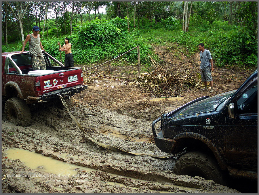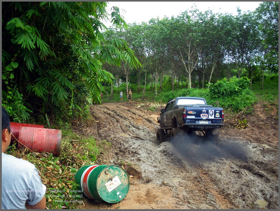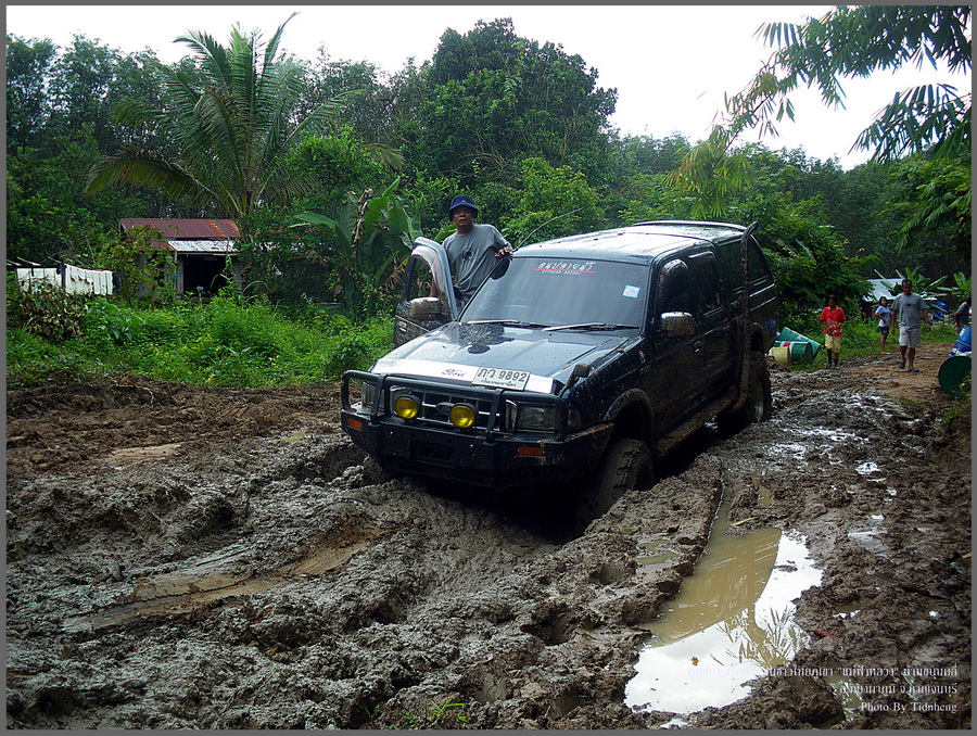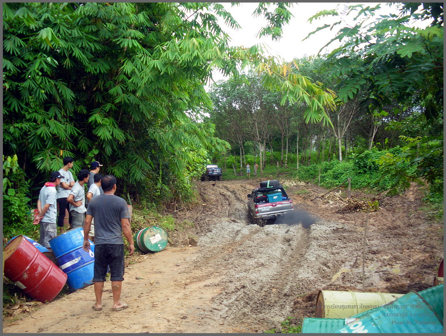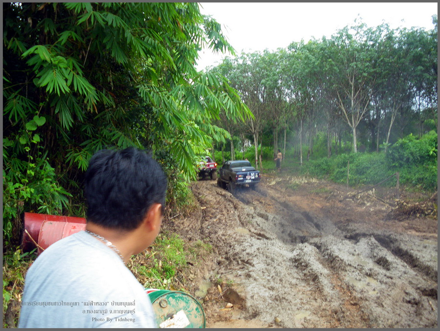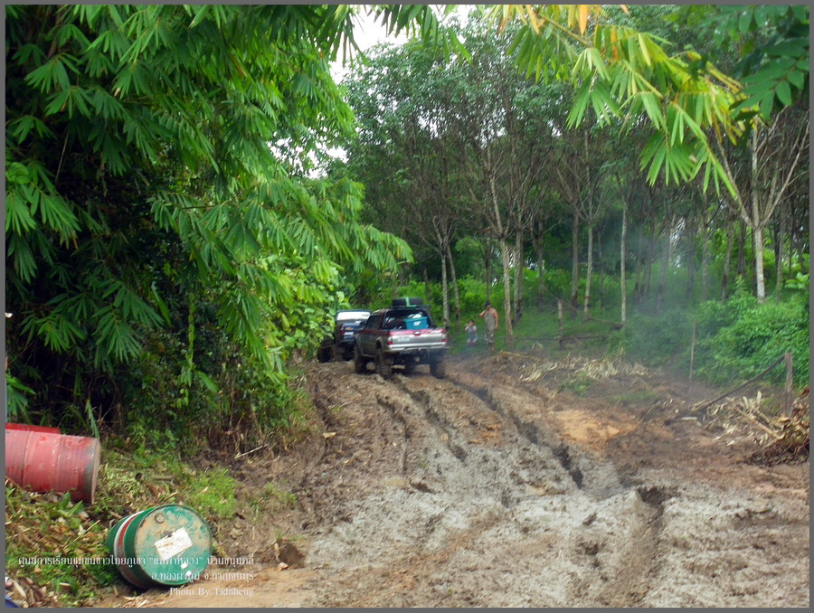 จากเหตุตอนขามาพวกเราไปชนต้นยางหัก เจ้าของสวนจึงไม่ยอมให้เราอ้อมขึ้นสวนเขาอีก ดังนั้นทุกคันต้องผ่านบ่อโคลนนี้
