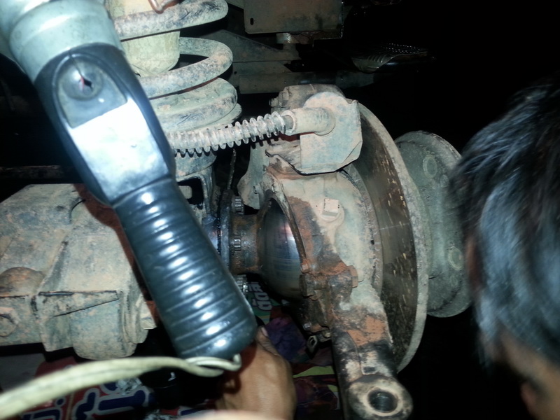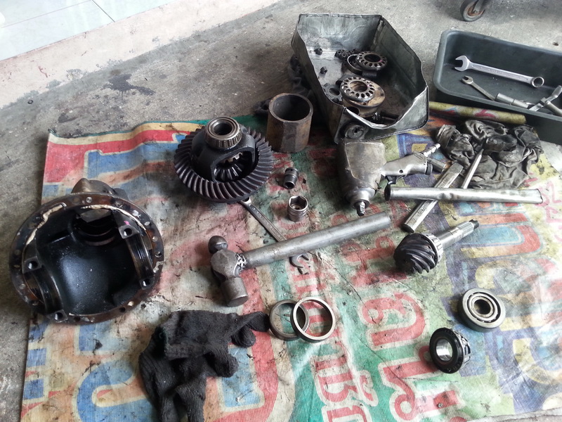 ทำกันกว่าจะเสร็จก็เกือบๆ 4 ทุ่ม เลยครับ นอกจากจะซ่อมเฟืองท้ายเปลี่ยนลูกปืนทั้งหมดแล้ว ผมต้องให้ช่างถอดกันโคลงหน้า-หลัง ออกทั้งหมดด้วย สาเหตุเพราะมันคดงอและลูกหมากแตกจากการกระแทกหินน้ำตก