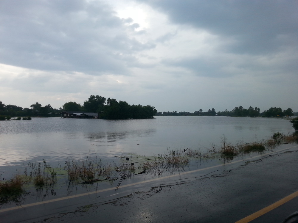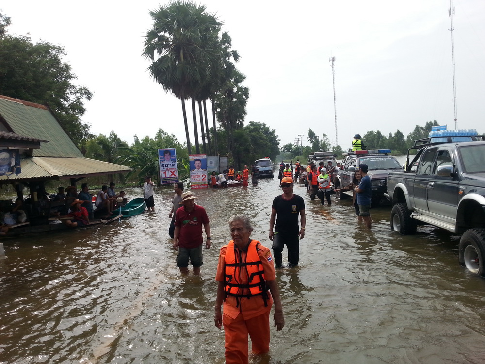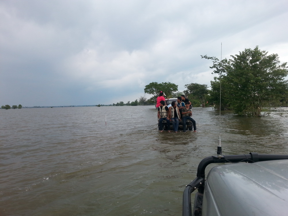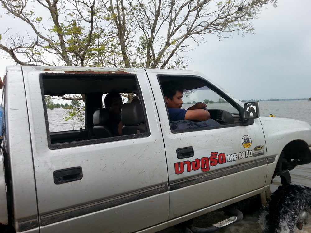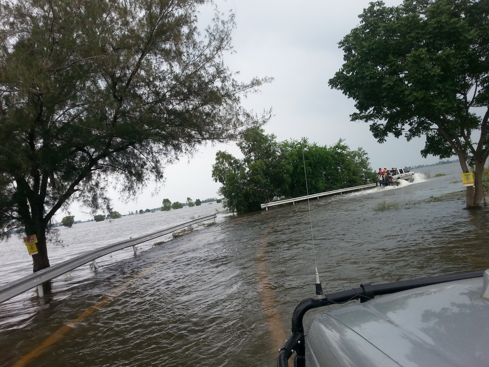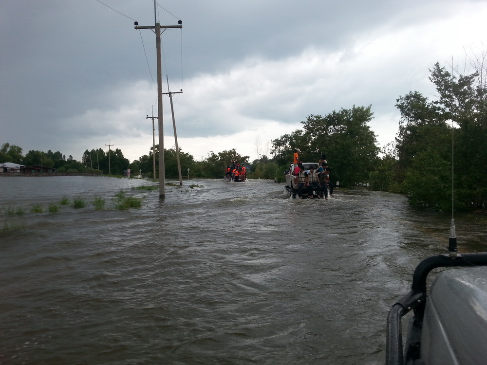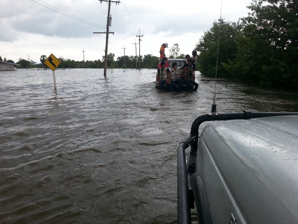 หลังจากรับทราบว่าทางข้างหน้ายังไม่มีรถเข้าไปได้เนื่องจากน้ำบนผิวจราจรสูงเกิน 1 เมตร พวกเราจึงได้อาสาเข้าไปครับ เอ้า...เตรียมดำน้ำ...บุ๋งๆๆๆ ปู้ดๆๆๆ