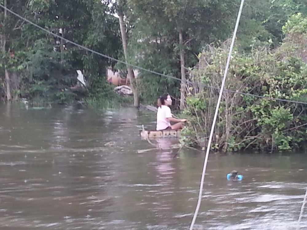 อ๋อ..น้องเค้ามาจากกู้ภัยร่มไทร กำลังพายเรือกลับออกมาจากในหมู่บ้านหลังจากนำของช่วยเหลือเข้าไปส่งมอบมา