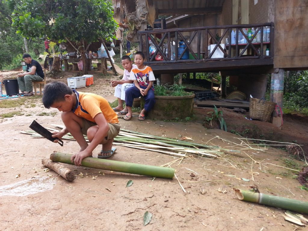 เด็กๆมาช่วยกันเจียกไม้ไผ่ เตรียมเทคอนกรีต
