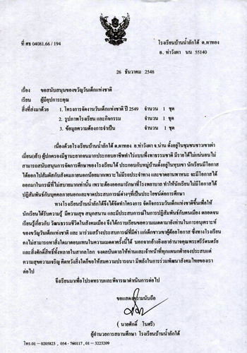 ขอเชิญร่วมจัดกิจกรรมการบริจาคสิ่งของ เครื่องใช้ในการเรียน ในวันเด็กแห่งชาติ 14 มกราคม 2549 ณ.โรงเรียนบ้านน้ำลักใต้ ต.ผาทอง อ.ท่าวังผา จ.น่าน