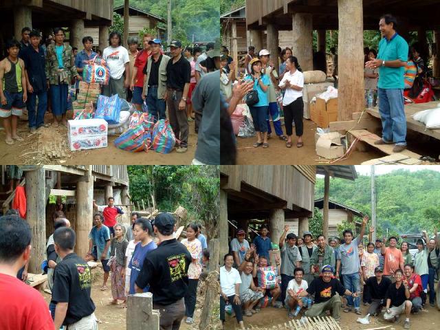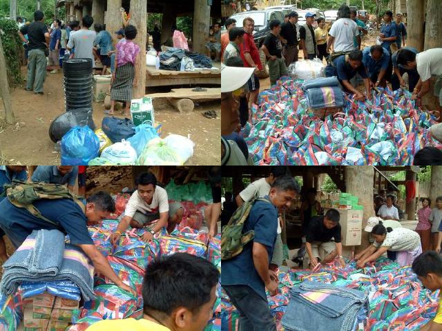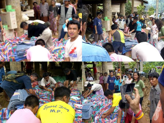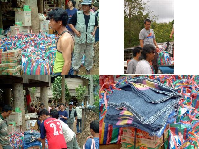 พอมาถึง พวกเราก็ขนถุงยังชีพลงมา 95 ชุด ตามจำนวนของชาวบ้าน พร้อมทั้ง บรรจุ ข้าวสาร(ข้าวเหนียว ถุงละ 2 Kgs.) กับถ้วยชาม ผ้าห่ม น้ำดื่ม เพิ่มเข้าไปอีกทุกถุงยังชีพ