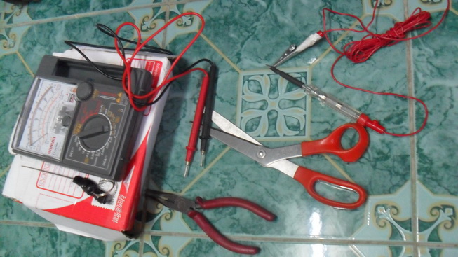 มิเตอร์ เช็คแล็ม กระดาษกาวย่น ดินสอ เข็ม ผ้าเทปพันสายไฟ กรรไก คีม และไฟจากแบตเตอรี่