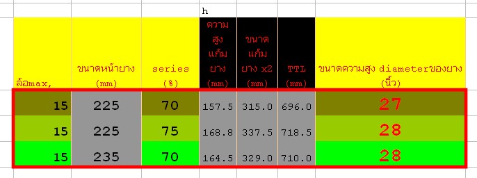 ของเดิมผมใส่ยางเบอร์ 235/75/R15 H/T (เทียบได้กับเส้นผ่าศูย์กลางล้อได้กี่นิ้วครับ)แต่รถผมไม่ได้ติตคิ้วล้อ แก้มยางก็เลยล้นออกมาเป็นนิ้วเลยครับ แรกๆก็ดูสวยดี ดูบึกบึน แต่นานเข้าชักเปลี่ยนใจ เพราะมันจะหนักพวงมาลัยเวลาเลี้ยวเข้าจอด และทราบมาว่าจะทำให้กินนำมันดวย ที่สำคัญคือเบรกไม่ค่อยอยู่(จานและชุดเบรกเดิม แต่วงล้อกว้างขึ้น รู้สึกว่ายางติดรถจะเป็นเบอร์ 225/70/R15 หรือเปล่าไม่แน่ใจ) ก็เลยคิว่าจะลดหน้ายางลง จากที่ใส่ในปัจจุบันนี้ เป็น 225/75/R15 เลยมีคำถามว่า เปรียบเทียบ 235/75/R15 กับ 225/75/R15 ขนาดของวงล้อแตกต่างกันมากไหมครับ และจะทำให้รถเตี้ยลงกว่าเดิมมากไหม ช่วยคำนวนให้หน่อยนะครับ(ความสุงเดิมกำลังสวยครับ กลัวลดลงแล้วไม่สวยน่ะ) ขอบคุณครับ