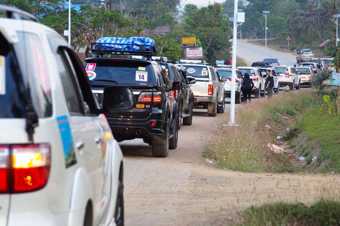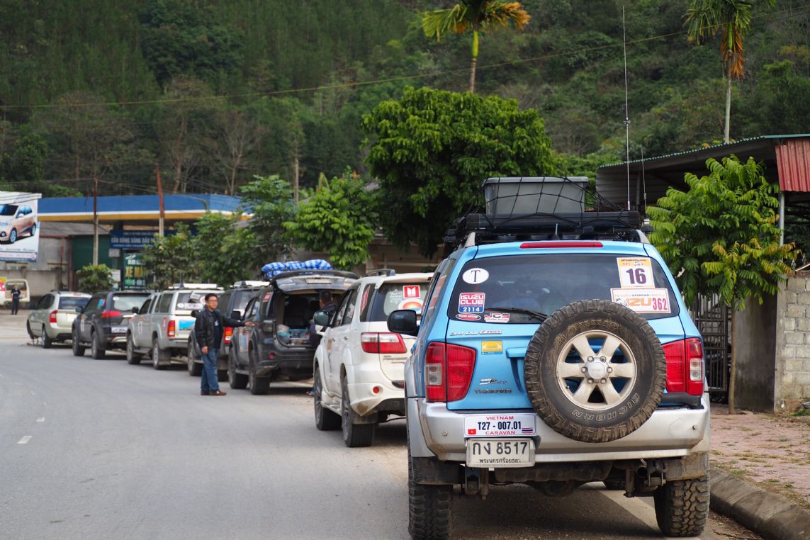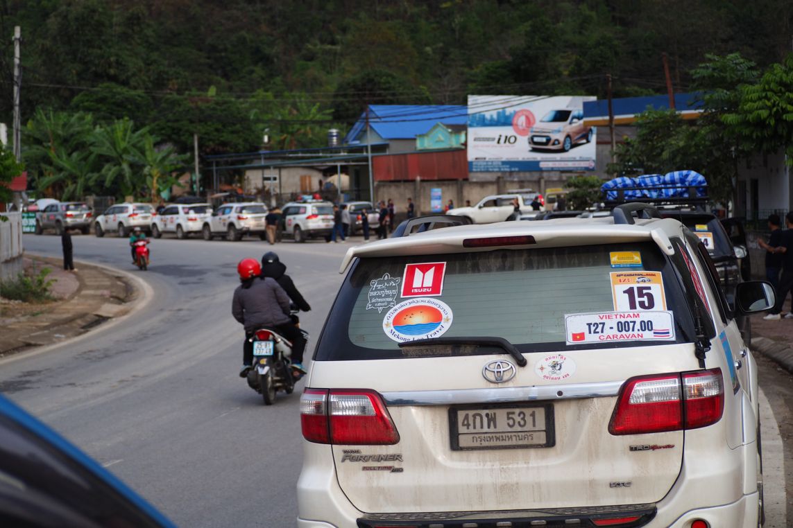 ออกเดินทางไปยังด่านห้วยโก๋นกับคณะคาราวานจำนวนหลายคัน แวะเตรียมเสบียงที่ อ.ปัว แวะทานข้าว อ. ทุ่งช้างและเติมน้ำมัน ณ ปั๊มสุดท้ายก่อนออกด่านห้วยโก๋น เพราะเราจะไม่เติมน้ำมันในลาว แต่จะข้ามไปเติมที่เวียดนามเลย น้ำมันลาวแพงกว่าไทยตก 39฿/L ที่เวียดนาม 23฿/L (อ้างถึงน้ำมันโซล่า) ถึงด่านห้วยโก๋นทำพิธีการผ่านแดน มี บ.ทัวร์ลาวมารอรับที่ฝั่งลาวด่านน้ำเงิน เราพักที่เมืองเงินในค่ำคืนนี้ เพื่อเตรียมเดินทางต่อในเวลาเช้ามืดของวันรุ่งขึ้น เราแบ่งกันพัก 2 ที่เพราะที่เมืองเงินเป็นเมืองเล็กๆ ไม่มีโรงแรมใหญ่ที่จะรองรับ 55 คน ระหว่าง 2 ที่พัก เราก็คุยกันผ่านวิทยุสื่อสาร