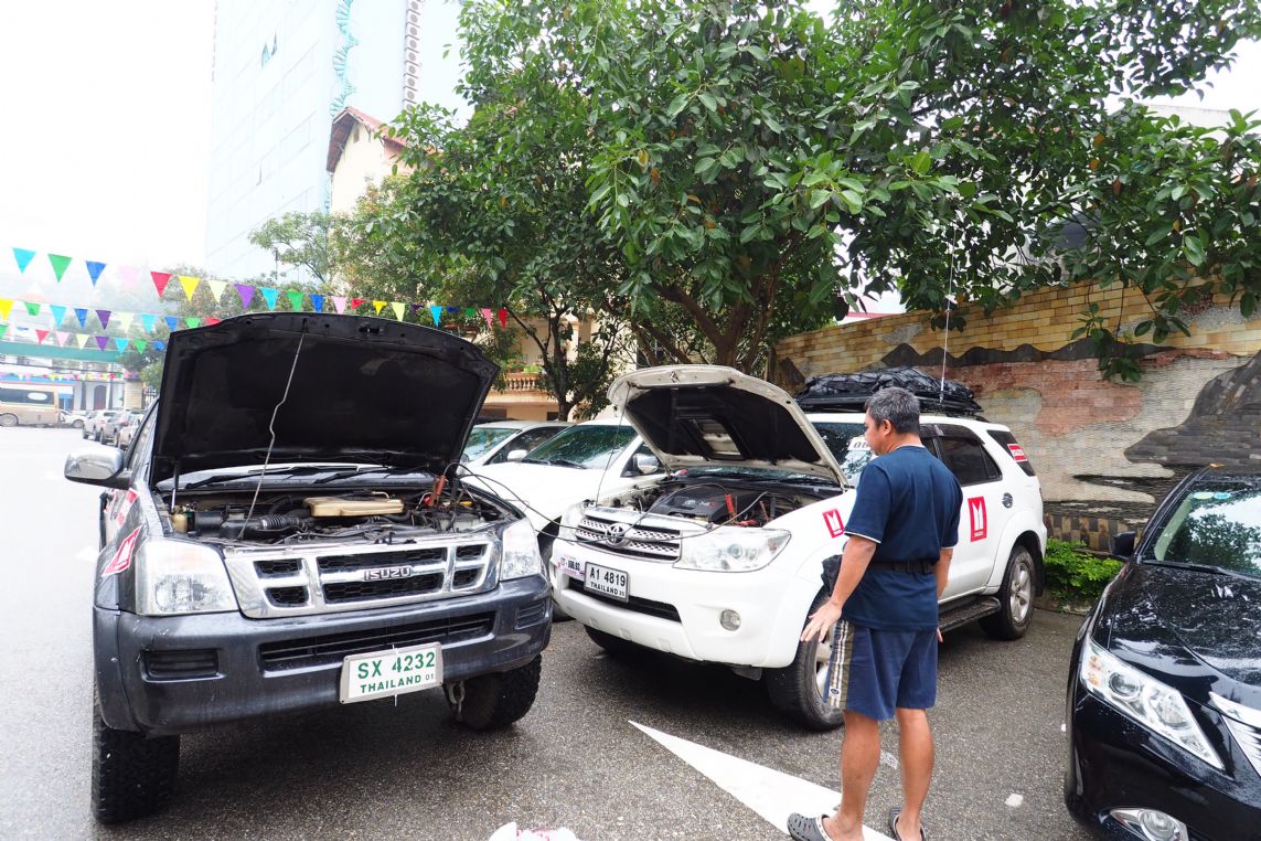 รถ 08 สต๊าทไม่ต้องการ ไฟหมด ทีแรกคิดว่าไดชาร์จเสียตั้งแต่เมื่อวันก่อน แต่พอไปร้านได้ บอกว่าได้ปกติ จึงเปลี่ยนแบตฯ ก็หายเลย พอกลับมาตั้งขบวนพบว่าล้อรถ 08 ถูกจุ๊บยางมอไซด์ตำทะลุ จึงต้องเสียเวลาปะยางอีกแป๊บนึงจึงล้อหมุนออกจากโรงแรม