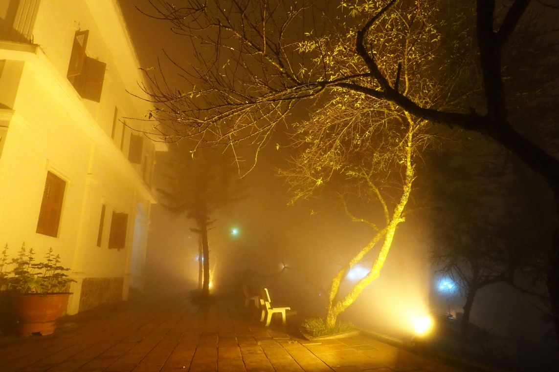 โบสถ์คริสต์ที่เป็นแลนด์มาร์คแห่งหนึ่งของซาปาในยามค่ำคืนที่มีหมอกหนา
