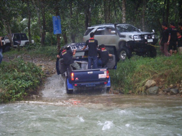 หลังจาก ที่จมอยู่ในน้ำอยู่ที่น้ำตกคลองมะเดื่อ ประมาณ 4-5 นาที และต้องใช้วินซ์ช่วยดึงขึ้นมาเนื่องจากน้ำลึกและแรงมาก รถใส่ชุดยก ยาง 285 ข้ามไปไม่ได้ครับ ที่ไปเพราะพาน้อง ๆ มารับน้องใหม่ (รถเพิ่งเสร็จ) มีfortuner+VX 80 Air Locker ARB( F-R) ยาง 37 / VIGO+VX 80 Dift Lock ยาง 37 บอกให้รอก็ไม่ยอม ข้ามไปก่อน เราจะไม่ข้ามน้อง ๆ ก็หาว่า ป๊อดเหรอพี่ อิ อิ ผมตามไปลงไปตรงไลน์ครับ พอถึงกลางคลอง โดนน้ำพัด ท้ายรถเป๋ ไปตามน้ำเลยครับ ปั้นไม่ขึ้น