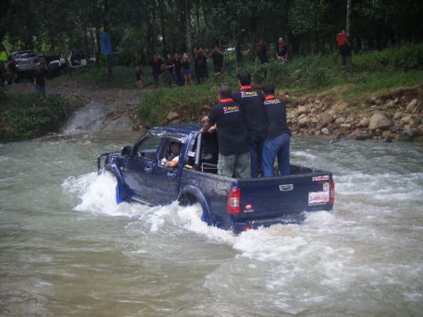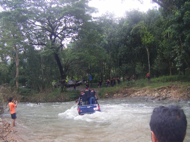 จากรูปย้อนกลับมานิดนึงครับ ตอนลงตรงไลน์ครับ พอถึงตรงกลับที่น้ำแรงและลึกสุด รถจะโดนน้ำพัดไปตามน้ำครับ ควรระวังกันด้วยครับ ควรจะมีรถเกี่ยวสายวินซ็ไว้ ท้ายรถเพื่อดึงกลับ หรือ รถยาง 37 ที่ข้ามไปได้ ต้องดึงสายวินซ์ออกมาเตรียมไว้เลยครับ เพราะถ้ารถเราโดนน้ำพัด จะได้เกี่ยวสายวินซ์กับตัวรถดึงได้ทันที เพื่อความรวดเร็ว น้ำจะได้ไม่เข้ารถครับ แต่ผมโดนน้อง ๆ แกล้ง บอกว่า ถ้าขึ้นไม่ได้โดนน้ำพัด ค่อยวินซ์ (น้อง ๆ บอกเดี๋ยวกลับไปไม่มีเรื่อง เล่า ให้ขำ ขำ ตื่นเต้นกัน แต่เราอะสงสารรถ อิ อิ )