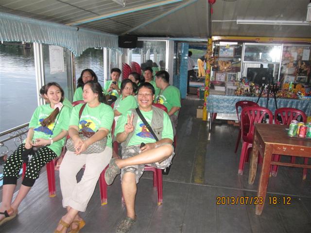 นั่งเรือมังกรล่องแม่น้ำหอม ใช้เรือถึงสองลำ เนื่องจากสมาชิกเรามีจำนวนมาก