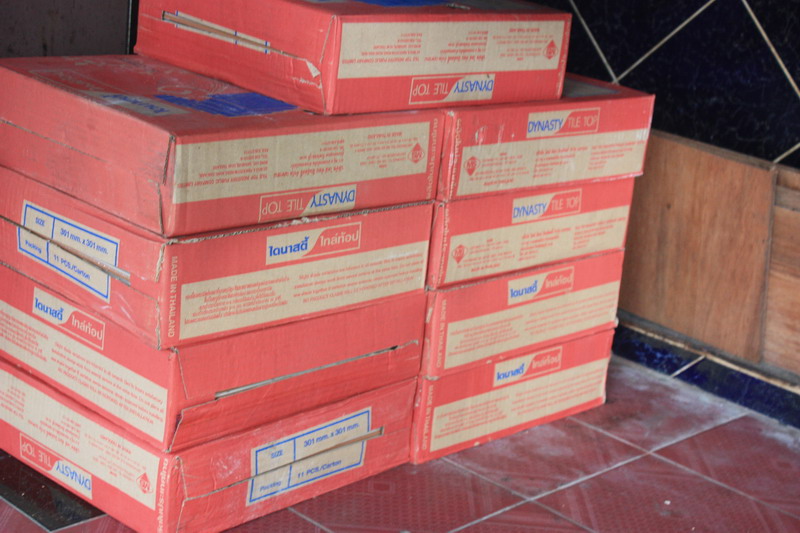 หัวส้วม 4 หัวและกระเบื้อง 9 กล่องเพื่อใช้กับห้องน้ำของน้องที่กำลังสร้างแล้ว เป็น