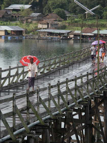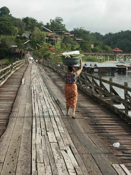 ผมจะแนะนำ Guide ให้นะครับเค้าจะยืนคอยถามว่าจะลงเรือมั้ย แล้วเดินตามผมไปเรื่อย คอยเล่าให้ฟังว่าประวัติสะพานเป็นไง แม่นำมาไง วัดจมน้ำได้ไง และรายละเอียดอีกเยอะที่เราไม่รู้ ค่าเรือ 200 บาทเอง นั่งได้8 คน แต่ผม ติ้บ ไปอีกคนละ 40 บาทเพราะประทับใจจริงๆๆ อายุแค่9 ขวบ อีกคน12 ขวบ แต่ถามอะไรเกี่ยวกับสังขละบุรี ได้คำตอบหมด อ้อเจ้าสองคนเนี้ยเก่งขนาดข่าวหลายช่องมาถ่ายเค้าแล้วนะ