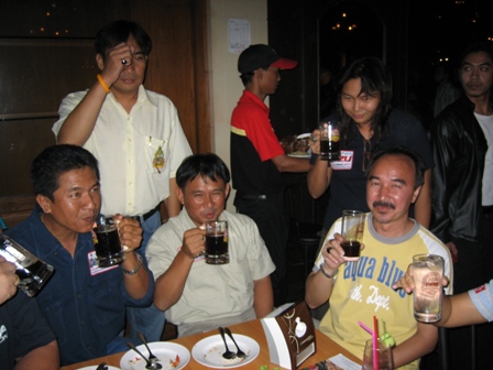 สะลึมสะลือตื่นมาเพราะมีภารกิจต้องเดินทางไปเมืองชล และมาเมาท์กับคอน้ำเปล่าที่ตื่นเช้าๆกันก่อนเดินทาง แต่นึกถึงบรรยากาศหนุกหนานมันส์ๆเมื่อคืนแล้ว เลยอยากดูภาพย้อนรอยสภาพงานสุมศรีษะที่โรงเบียร์ค่ะ เพราะว่ากรรมการบางท่านอาจจะจำเหตุการณ์ และหน้าเพื่อนไม่ได้ ณ เวลานั้น ( เลียนแบบตาจกไง พอดึกๆ เริ่มจำหน้าเพื่อนร่วมวงไม่ได้ อิ อิ )