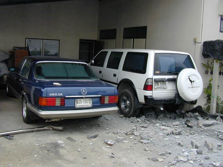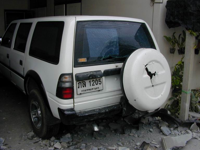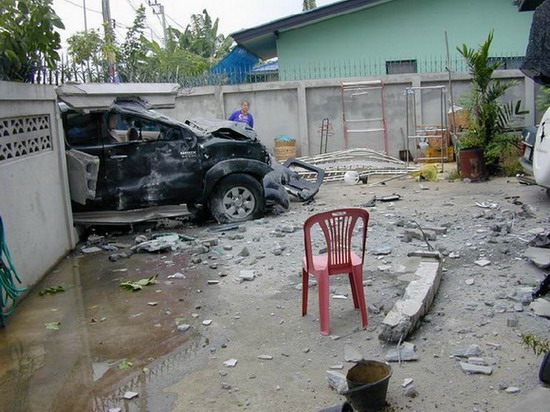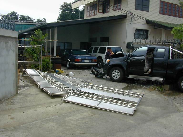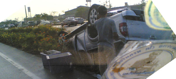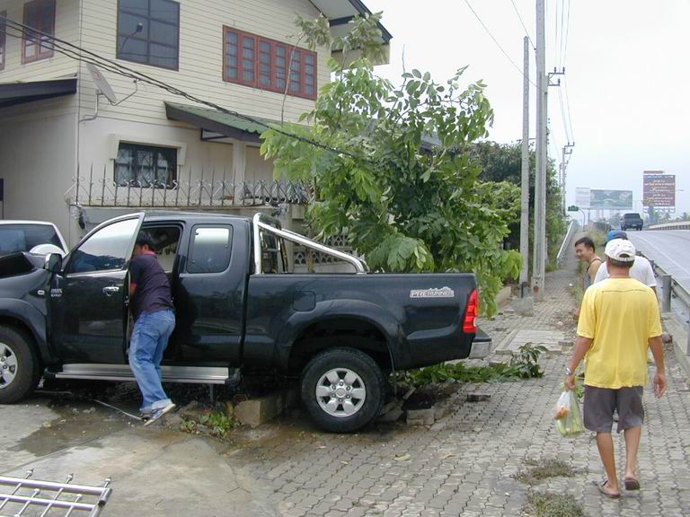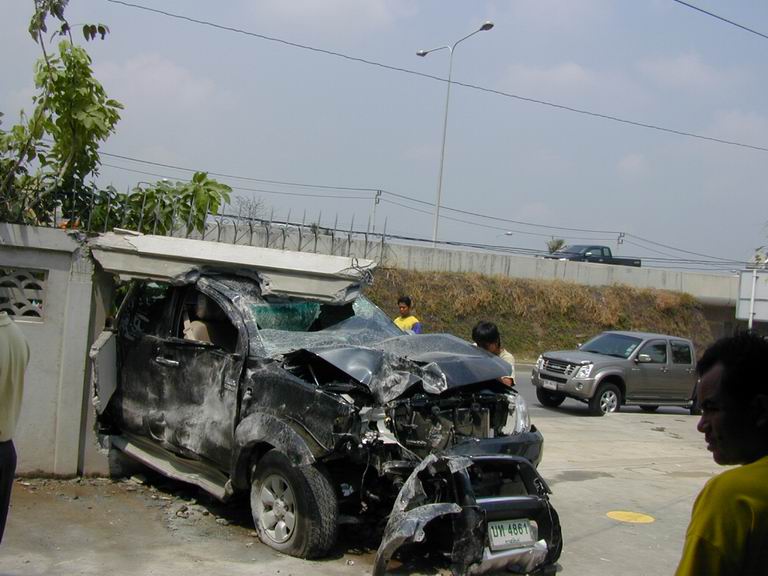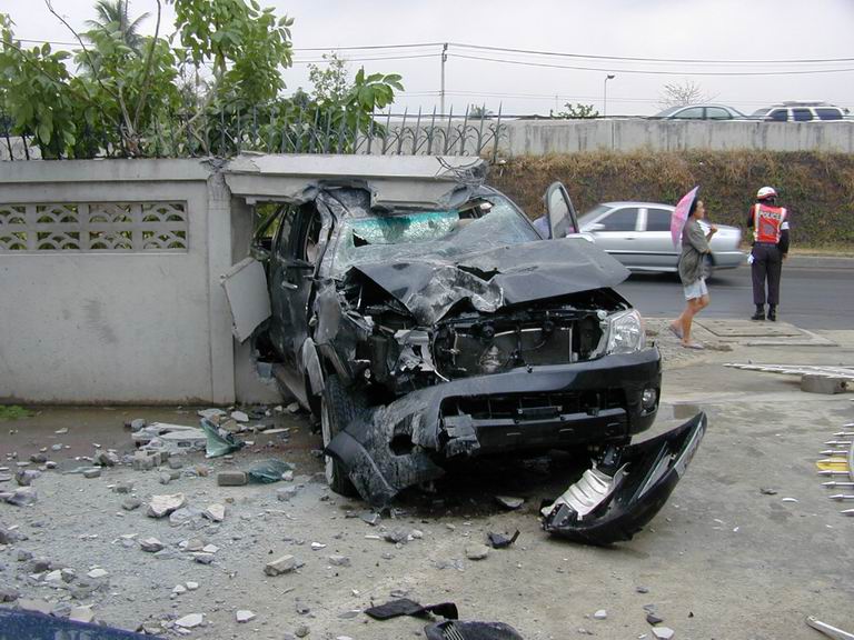 เช้าวันนั้น....เป็นเช้าที่อากาศไม่ร้อน แดดไม่แรงเพราะฝนตกพรำๆ ถนนกำลังลื่น....โครม!!!! เสียงดังลั่น มาพร้อมกับฝุ่นฟุ้งกระจายไปทั่วบริเวณ....และก็..ตามที่เห็นในภาพครับ ท่านพลขับอ้างว่า หักหลบ จยย วิ่งย้อนศรจากเลนซ้ายไปเลนขวา และหักกลับมาซ้าย ถนนลื่นรถจึงเสียหลัก วิ่งมาเบรกกับกำแพงรั้วบ้าน