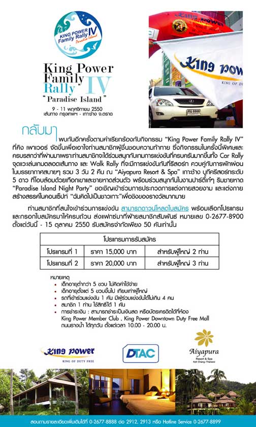 มีความยินดีที่จะขอเรียนเชิญท่านสมาชิก เข้าร่วมกิจกรรม King power Family Rally ครั้งที่ 4 ซึ่งในปีนี้ถือว่ามีความพิเศษกว่าทุกปี