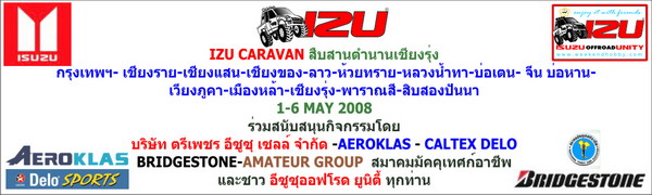 ....................และแล้วเวลาแห่งความสุขสนุกสนาน ของการเดินทางไกลก็กลับถึงถิ่นฐานของเรา จากเส้นทางคาราวานสืบสานตำนานเชียงรุ่ง บนเส้นทางกรุงเทพฯ -เชียงราย-เชียงแสน-เชียงของ-ห้วยทราย-เวียงภูคา-หลวงน้ำทา-นาเตย-บ่อเต็น-บ่อหาน- เมืองหล้า-สิบสองปันนา-กาหลั่นป้า-เชียงรุ่ง ในวันที่ 1-6 พฤษภาคม พ.ศ. 2551 กับขบวนคาราวานมิตรภาพ 20 คัน 74 ชีวิตต่างวัยต่างสถานภาพต่างความฝัน ของชาว IZU แต่ ทุกท่าน มีความรักในสิ่งเดียวกันคือ ...........รักในการเดินทางท่องเที่ยว การทำกิจกรรมการกุศลเป็นหมู่คณะด้วยยานพาหนะคู่ใจของเราท่านเองค่ะ
