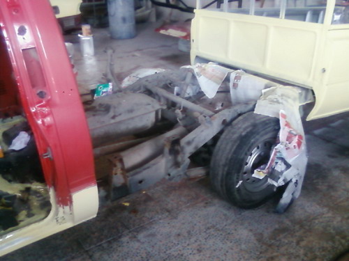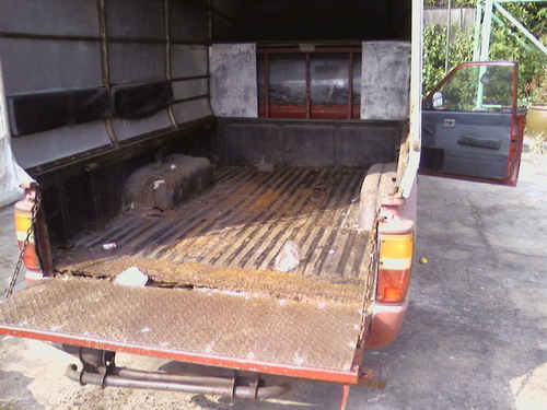 ประเดิมด้วยสภาพก่อนไปซ่อมนะครับ คำเดียวซาก...กระบะผุไม่เหลือผมเองขึ้นไปยืนไม่ได้เพราะมันทะลุ สภาพภายนอกผุรอบคัน กระจกหลังแตก ตะเข็บพื้นรถขาด เรียกได้ว่ารื้อทำใหม่ทั้งคันกันเลยทีเดียว