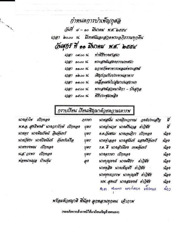 วันศุกร์ที่ ๑๑ มีนาคม ๕๔ เวลา ๑๕.๐๐ น. ณ ฌาปนสถานบ้านน้ำจำ ตำบทหลวงใต้ อ.งาว จ.ลำปาง