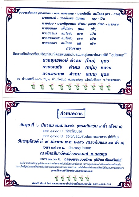 นายอนงค์ นางอัมพร ฉิมพุฒ ขอเชิญร่วมงานอุปสมบทหลานชาย