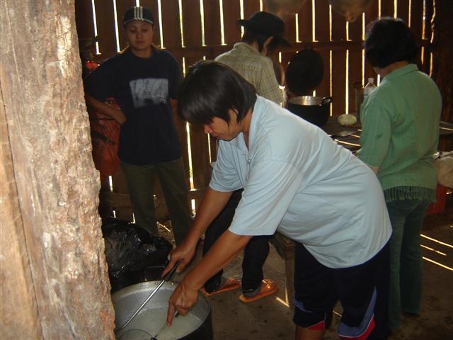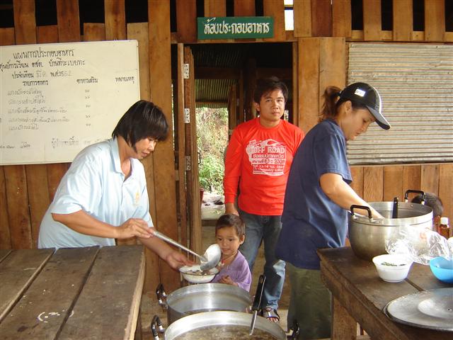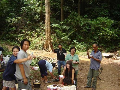กลางป่าทึบมีริมธาร (ที่ไหลมาจากน้ำตก) หยุดทำอาหารกินมื้อเที่ยงพอดี...