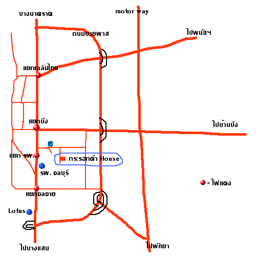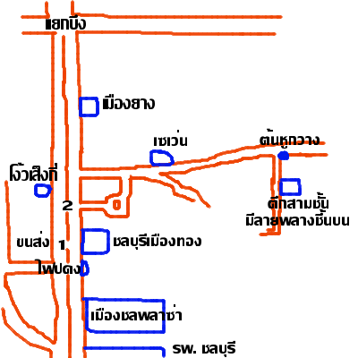 เมื่อพ้นไฟแดงตรง ชลบุรีเมืองทอง (ผลิตอุปกรณ์รถไถ) ให้สังเกตุ จะมีที่กลับแรกทางขวา ให้เลยไปอีกนิดแล้วจะเจอที่กลับรถที่ 2 ให้เลี้ยวขวาเข้าไป จะเจอคล้ายๆวงเวียน วนรอบแล้วเลี้ยวซ้าย ตามแผนที่เลย (ถ้าจำไม่ผิดนะ) เข้าไปจะเจอแยกซ้ายขวา ไปทางซ้าย ไปสักพักประมาณ 500 เมตรมั้ง จะเจอต้นหูกวางขวามือ มีร้านค้าอยู่หน้าปากซอย เลี้ยวเข้าไปหาที่จอดริมๆถนนนั่นเลย เลี้ยวเข้าไปแล้วสังเกตุตึกสามชั้น ชั้นบนสุดจะมีลายพลางแบบทหาร หาไม่ยาก ขอให้โชคดี