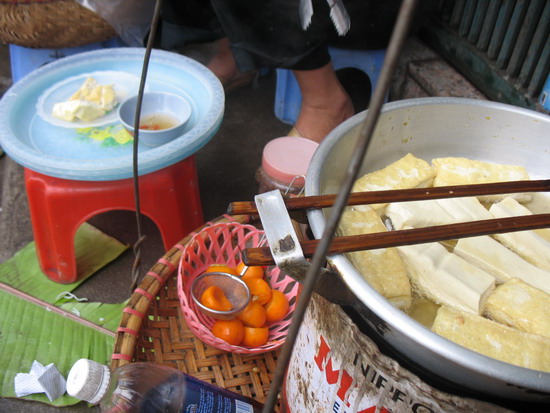 เต้าหูใหม่ๆ ทอดให้เหลืองร้อนๆ มีเลม่อนสีส้มๆ บีบใส่น้ำจิ้มพริกน้ำปลา