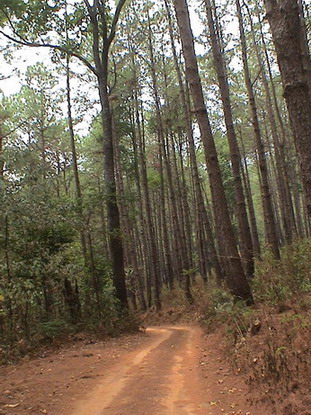 ระหว่างทางก่อนเข้าบ้านโป่งลมแรง ผ่านป่าสนที่สวยงามสองข้างทาง