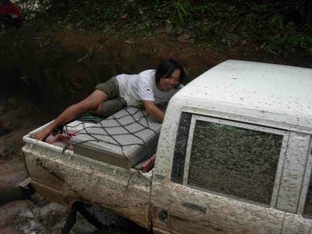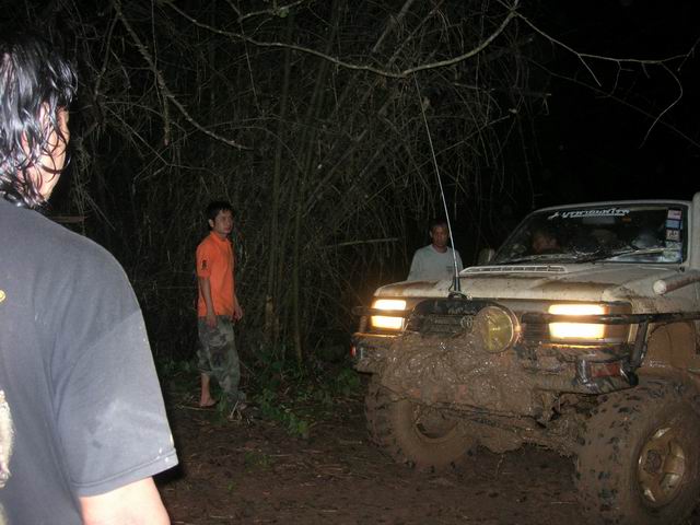เวลาก็ประมาณ 1 ทุ่ม ซ่อมเสร็จก็ประมาณ 2 ทุ่ม หิวแล้วซิ ตกลงกันว่านอนตรงนี้ดีกว่า ถึงจะเข้าไปก็ไปไม่ถึง(กลัวองค์ประทับอีก) ซ่อมม้ากระโดดเสร็จ ข้ามกลับมาที่พัก โคลนเต็มหน้ารถเลย