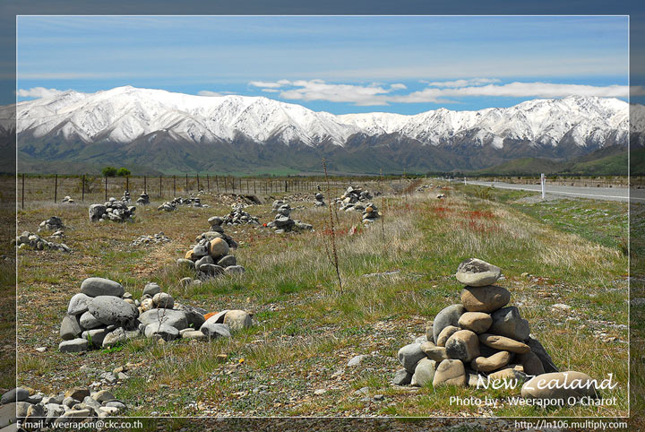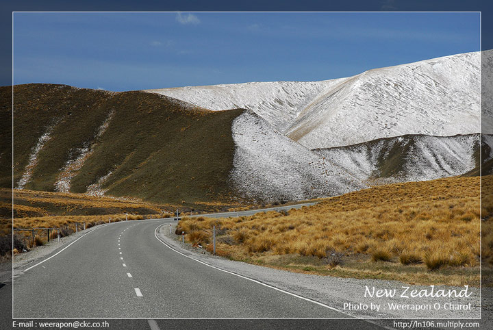เส้นทางยังมุ่งหน้าต่อไปยังเมือง Omarama เริ่มเห็นเทือกเขา southern alps เทือกใหญ่หิมะขาวโพลน