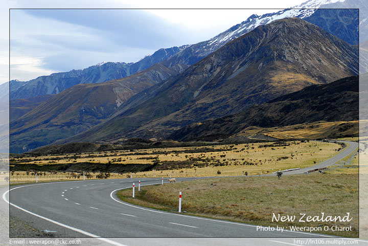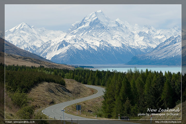 เส้นทางคดเคี้ยวเลาะทะเลสาบเห็นยอดตระหง่านของ Mt Cook เป็นจุดหมายอยู่
