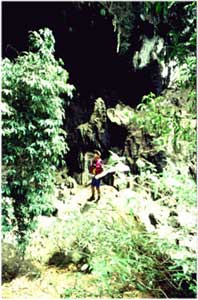 ผมเดินบนหินสลับดินขึ้นเขา โดยเลาะป่าและลำคลองงูไปเรื่อยๆ จนมาพบโพรงสุดท้ายที่ลำคลองงูมุดหายไป อันถือเป็นจุดสิ้นสุดเขตของถ้ำนกนางแอ่นพี่เจ้าหน้าที่นั่งรออยู่ เพราะต่างคนต่างเดิน ทำให้ทิ้งระยะกันพอสมควร ขึ้นเขาเลยครับท่าน เดินไปพักเหนื่อยไปเลยผมจนมารวมตัวกันอีกครั้งก่อนเข้าถ้ำใหญ่ พี่ต้นบอกว่าให้วางของไว้ตรงนี้ได้เลย เพราะลงไป แล้วเดี๋ยวก็ขึ้นมา