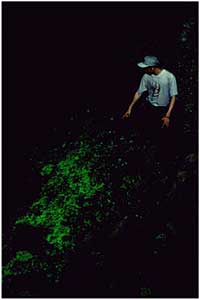 จากข้อมูลที่ทราบ มอสเรืองแสงเป็นพืชประหลาดที่จะสะท้อนแสงจนเป็นสีเขียวสดสว่างได้ แต่ก็เพียงมุมเดียวเท่านั้น หากมองไม่ตรงกับมุมนี้ จะมองเห็นเป็นสีเขียวธรรมดา ไม่สดสว่างสวยงามเลยอยากถ่ายรูปใจจะขาด รีบแกะอาวุธออกจากหีบห่อ แต่ขาตั้งจ๋า ยังอยู่กับนายหมุกอยู่เลย แง แงเลยต้องถ่ายมุมที่พอมีแสงรอขาตั้งไปก่อน เล็งไปยังมุมเบื้องหน้าที่จะมุ่งไป ถ้ำช่วงนี้มีระยะแค่ไม่เกินร้อยเมตรเท่านั้น ช่วงกลาง ๆ ของถ้ำแสงจะต่ำ แต่ปากถ้ำทั้งสองด้านสูงมาก ทำให้แสงเข้ามาจนมองเห็นทางโดยไม่ต้องพึ่งไฟฉาย